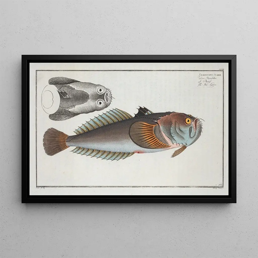 The art print of "Uranoscopus scaber, the flashlight fish" is an ideal choice to enrich your interior decor. Whether in an office, a bathroom, or a living room, this canvas adds a touch of originality and curiosity. The quality of the art print ensures remarkable fidelity to the details and colors of the original work, allowing you to fully appreciate its aesthetic appeal. By incorporating this painting into your space, you invite a part of the marine universe into your home, while celebrating the artistic legacy of Marcus Elieser Bloch.