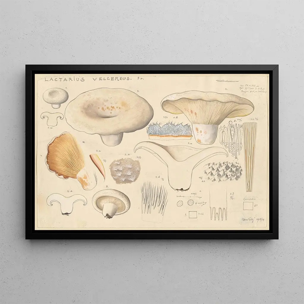 The art print of "Velvet Milk Cap" is an ideal decorative piece to enrich your interior. Whether in a living room, office, or bedroom, this artwork adds a touch of elegance and mystery. Its printing quality guarantees remarkable fidelity to the details of the original work, while offering undeniable aesthetic appeal. By choosing this canvas, you invite not only the beauty of nature into your space but also a piece of artistic history that will captivate your guests and stimulate contemplation.