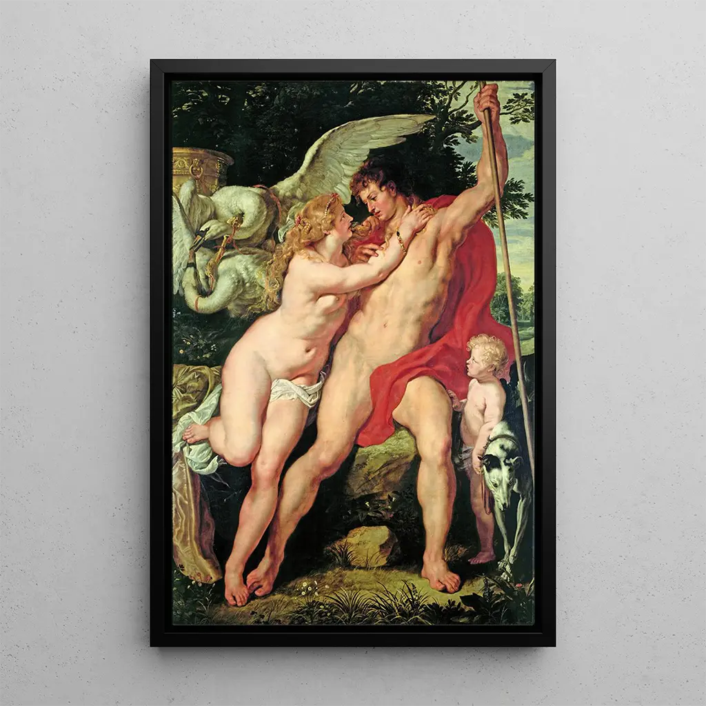 Rubens, an emblematic figure of baroque, knew how to mark his era with his flamboyant style and his ability to convey emotions. Born in 1577 in Siegen, Germany, he grew up in Flanders, where he absorbed Italian influences, notably those of Michelangelo and Caravaggio. His work, rich in colors and movement, demonstrates exceptional technical mastery. As a court painter, he also contributed to political propaganda through his works, making him an essential artist of the 17th century. "Venus and Adonis" perfectly illustrates his talent for blending mythology and humanism.