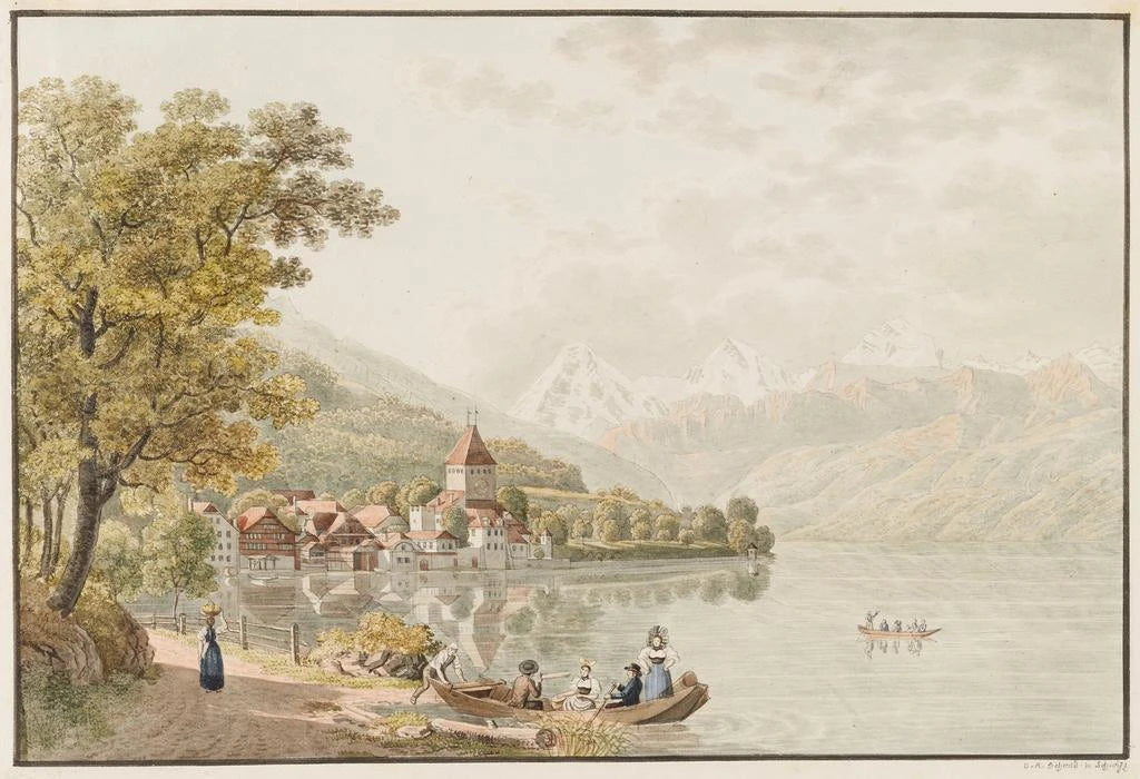 David Alois Schmid : un témoin de la beauté alpine David Alois Schmid, peintre suisse du XIXe siècle, est reconnu pour ses paysages qui célèbrent la nature alpine. Influencé par le romantisme, il cherche à exprimer l'émotion et la grandeur des paysages suisses. Schmid a su capturer la lumière et l'atmosphère de ses sujets, ce qui lui a valu une place de choix dans l'histoire de l'art suisse. Ses œuvres, souvent inspirées par ses voyages à travers les Alpes, témoignent d'une époque où la nature était perçue comme une source d'inspiration et de contemplation. "Vue d'Oberhofen sur le Lac de Thoune" est un parfait exemple de son talent pour traduire la beauté naturelle en art.