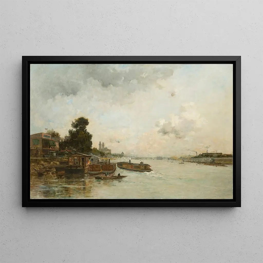 The art print View of the Seine in Paris captures the very essence of Parisian life by the water's edge. The shimmering reflections of the sun on the surface of the Seine, blended with the pastel shades of the sky, create a vibrant and dynamic atmosphere. The oil painting technique used by the artist allows for a realistic depiction of the water's fluidity and the lightness of the clouds, while the silhouettes of boats and passersby add a human dimension to this scene. This art print not only evokes the beauty of the city but also its lively rhythm, inviting the viewer to feel the energy of Paris.