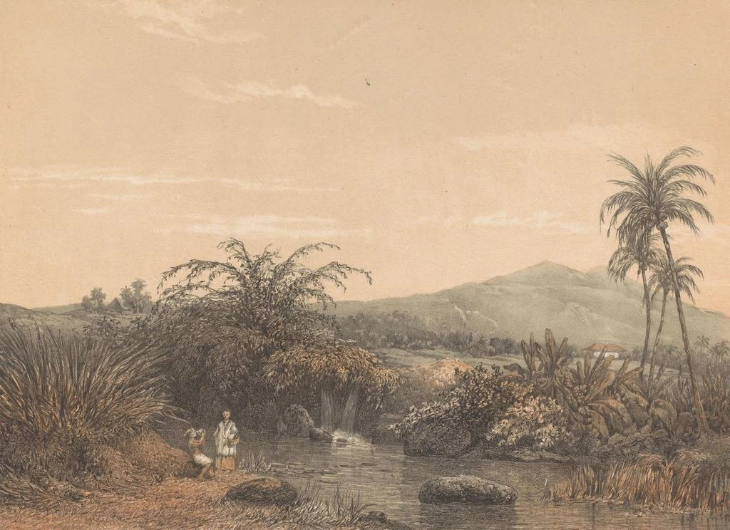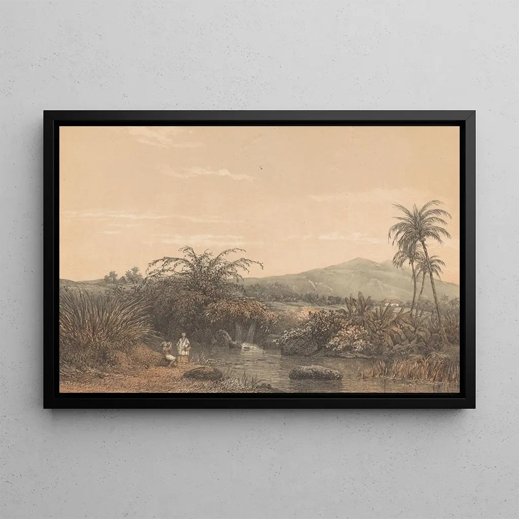 The "View of Tjileboet" by Johan Conrad Greive transports the viewer to the heart of a lush Indonesian landscape. This art print, rich in detail, depicts a scene where nature flourishes in all its splendor. The vibrant green hues of the foliage blend with the soft shades of the sky, creating an atmosphere of peace and harmony. Greive's technique, which combines realism with impressionist touches, allows you to feel the warmth and humidity of this idyllic place. This piece invites a sensory escape, where each glance reveals a new facet of this enchanting landscape.
