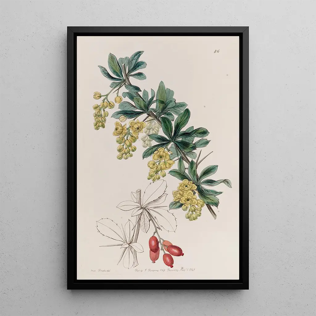 The art print "Barberry of Tanners" by Sydenham Edwards stands out for its delicate and detailed depiction of this hardy plant. The rich shades of green and yellow, accentuated by touches of red, create a lively tableau that evokes the strength of nature. The watercolor technique used by Edwards captures the texture of the leaves and the shape of the berries, making the piece both realistic and poetic. The atmosphere conveyed by this canvas is imbued with serenity, inviting the viewer to appreciate the beauty of often overlooked elements of the natural world.