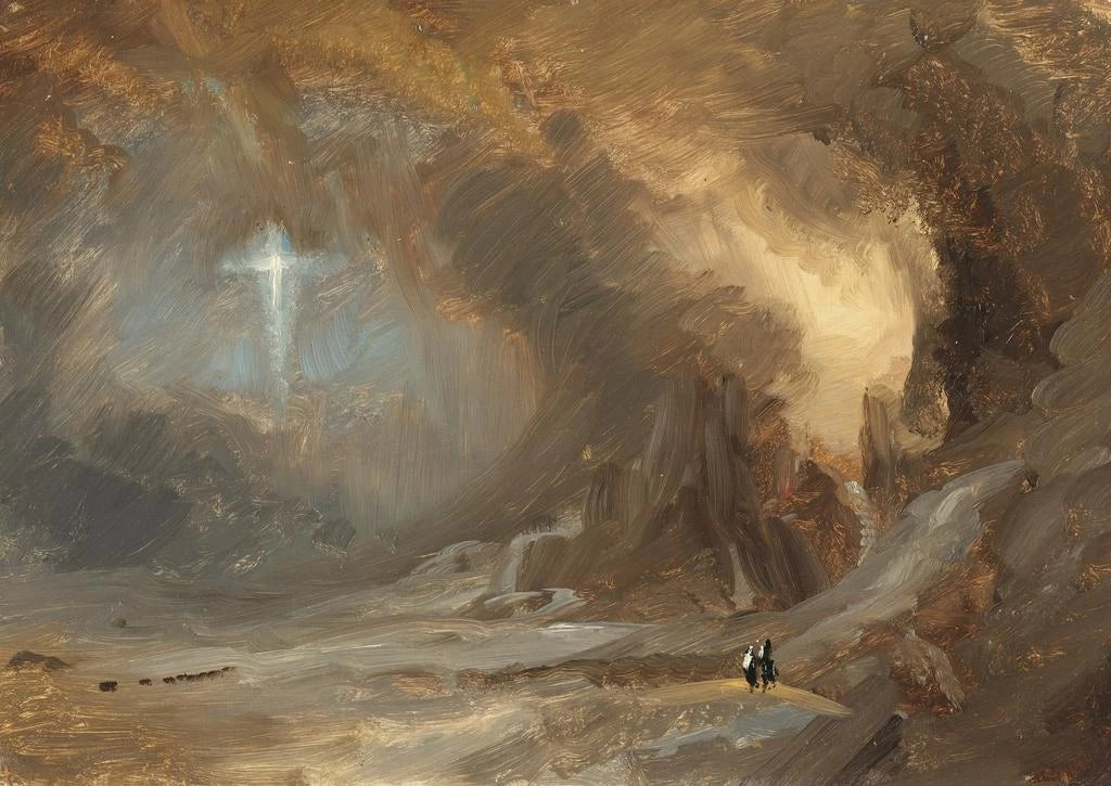 "Vision of the Cross" by Frederic Edwin Church is a captivating artwork that evokes a mystical experience. The canvas, bathed in golden light, depicts a scene where the cross stands majestically atop a mountain, surrounded by clouds and grand landscapes. The vibrant colors, ranging from bright oranges to deep blues, create an atmosphere that is both dramatic and soothing. Church's technique, characterized by meticulous realism and particular attention to detail, allows viewers to feel the spiritual power of this vision.