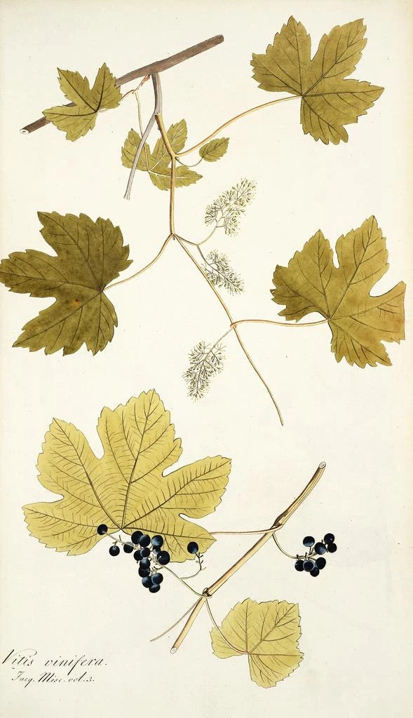 The art print of Vitis vinifera transports us into the intoxicating world of vineyards, symbols of wealth and culture. The shades of green and purple blend harmoniously, evoking ripe grape clusters and lush leaves. The artist's technique, which combines realism and delicacy, creates a warm and welcoming atmosphere. This painting is a true celebration of nature, inviting appreciation of the beauty of the vines and reflection on their importance in our cultural heritage.