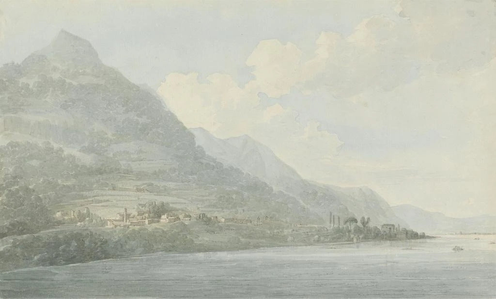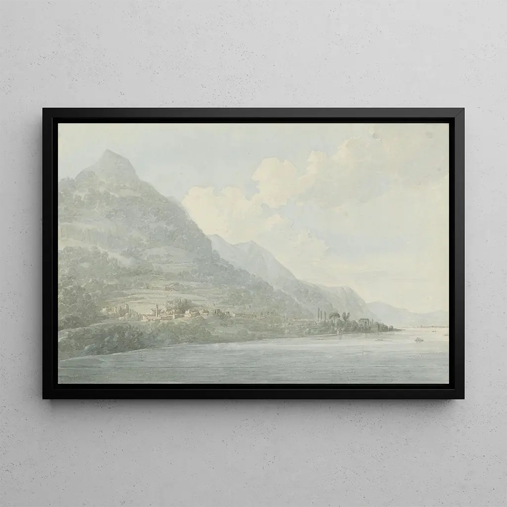 In this art print of View of Lake Como, John Webber transports us to an enchanting landscape where nature and architecture meet harmoniously. The soft shades of blue and green evoke the serenity of the lake's waters, while touches of light illuminate the picturesque houses lining its shores. Webber's technique, blending watercolor and oil, creates a dreamy, almost ethereal atmosphere that invites contemplation. Every detail, from the reflections in the water to the shadows of the mountains, testifies to his skill in capturing the beauty of a fleeting moment.