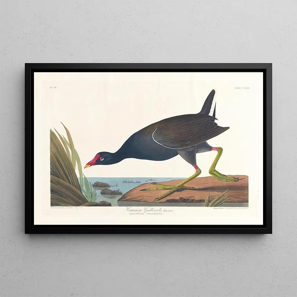 Male adult Moorhen art print: a portrait of wild nature The art print of the male adult Moorhen immerses us in a vibrant universe of colors and details. Audubon's work captures the beauty of this aquatic bird, with its richly colored plumage and delicate features. Shades of green, blue, and red blend harmoniously, creating a lively and dynamic atmosphere. The watercolor technique, combined with meticulous drawing, pays tribute to the grace of this bird while evoking the serenity of the natural habitats it inhabits. This piece is a true invitation to marvel at wildlife. John James Audubon: pioneer of artistic ornithology John James Audubon was an artist and naturalist of the early 19th century, famous for his ornithological studies. Born in Haiti in 1785, he emigrated to the United States where he dedicated his life to observing and depicting American birds. His style, blending realism and romanticism, revolutionized the way birds were represented in art. Audubon was influenced by American landscapes and biodiversity he encountered, leading to iconic works such as the series "The Birds of America." His legacy endures, making him an essential figure in naturalist art. A decorative acquisition with multiple assets The art print of the male adult Moorhen is an ideal decorative choice to enhance your interior. Whether in a living room, office, or bedroom, this canvas adds a touch of elegance and nature. Its printing quality guarantees fidelity to the colors and details of the original work, allowing you to enjoy undeniable aesthetic appeal. By choosing this art print, you opt for a piece that sparks curiosity and admiration, while celebrating the beauty of avian wildlife.