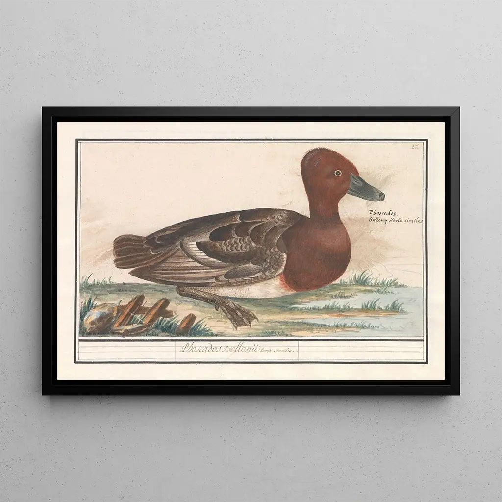 The art print of "Singing Duck (Anas penelope)" by Anselmus Botius de Boodt is a tribute to the beauty of nature. This 17th-century piece highlights a singing duck, with meticulous details and delicate colors capturing the essence of this aquatic bird. The color palette, dominated by shades of green, blue, and brown, evokes the natural habitats where this species lives. The artist's technique, blending realism and finesse, allows viewers to feel the lightness of the plumage and the grace of the duck in its environment. This canvas invites contemplation of wildlife and flora, while celebrating the tranquility of aquatic landscapes.