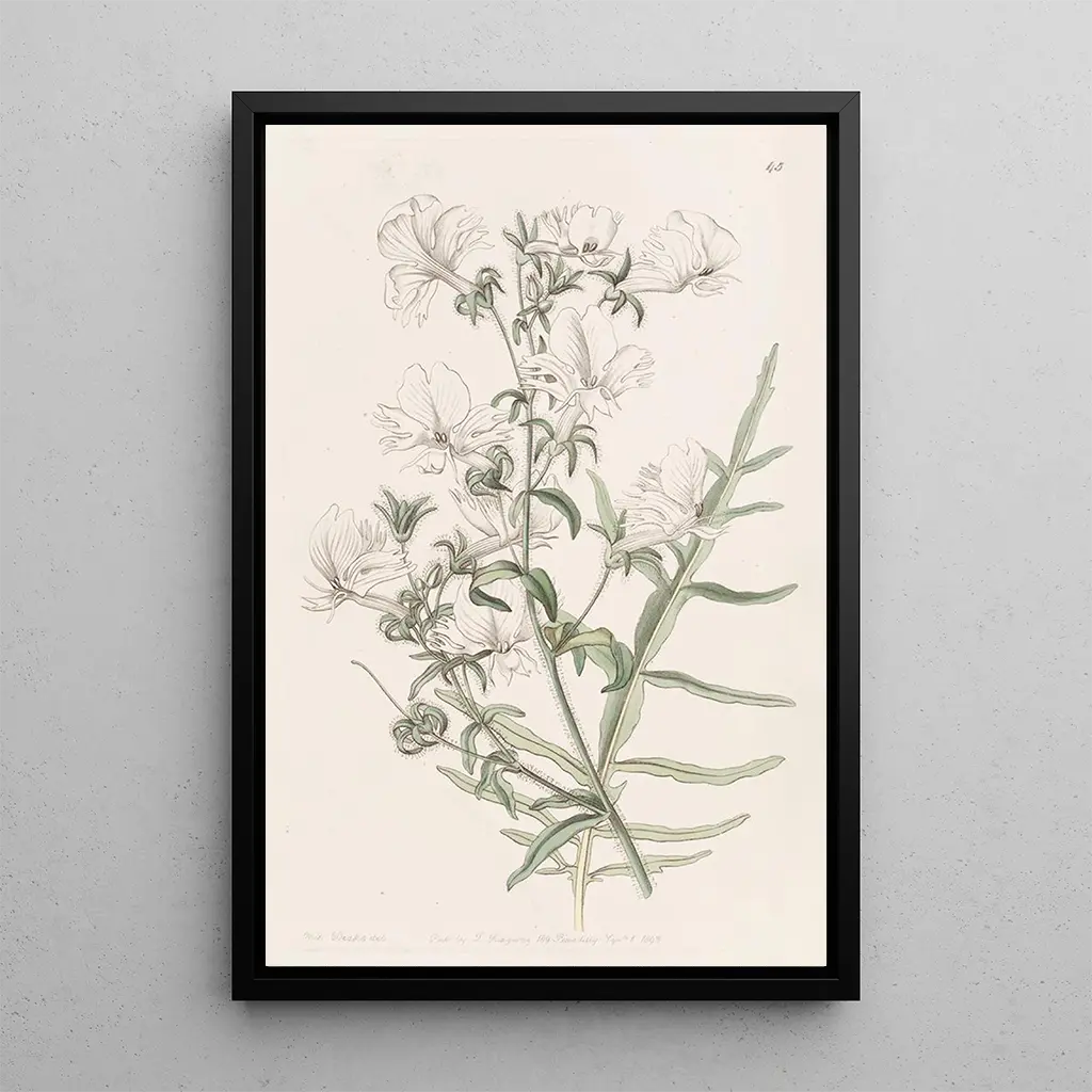 The art print Schizanthus white, created by Sydenham Edwards, immerses us in a world of softness and lightness. The delicate petals of this flower, with white shades and a slight tint of green, bloom gracefully, evoking a subtle dance in the breeze. The watercolor technique, used with mastery, gives the piece an airy and ethereal atmosphere, where every detail is carefully highlighted. The play of light and shadow creates a captivating depth, inviting the viewer to come closer and admire the fragile beauty of this plant.