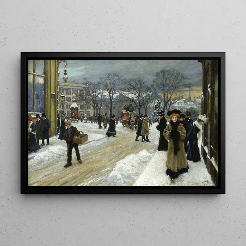 "Winter Day at Kongens Nytorv" by Paul Fischer vividly captures the essence of a cold day in Copenhagen, where snow blankets the cobblestones and the silhouettes of passersby. White and gray tones dominate the canvas, creating a wintery atmosphere filled with softness. Fischer uses fluid brushstrokes to depict snowflakes falling slowly, while the architectural details of the buildings in the background add a historical dimension to the scene. This artwork evokes a sense of calm and beauty, inviting the viewer to immerse themselves in the peaceful ambiance of a Danish winter.
