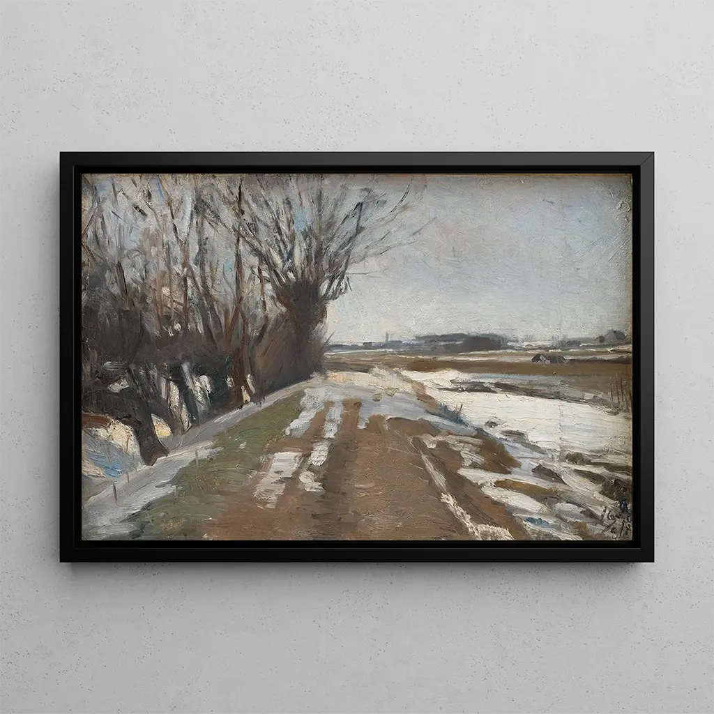 Winter Landscape at Utterslev near Copenhagen: an icy serenity The painting "Winter Landscape at Utterslev near Copenhagen" by Albert Gottschalk evokes a peaceful and contemplative atmosphere. The cool shades of blue and white dominate the composition, creating a striking contrast with the touches of brown in the bare trees. The oil painting technique imparts a rich texture, while the diffused light seems to filter through the clouds, delicately illuminating the snowy landscape. This art print invites an imaginary walk in a winter setting, where the silence of nature blends with the beauty of snowflakes. Albert Gottschalk: a master of Danish landscape painting Albert Gottschalk, born in 1850, is a Danish painter recognized for his evocative landscapes. Influenced by the Impressionist movement, he captured the light and atmosphere of nature with a unique sensitivity. His career spans the late 19th and early 20th centuries, during which he explored various themes, including rural life and Scandinavian landscapes. Gottschalk played a key role in the evolution of Danish painting, bringing a modern approach to landscape representation while remaining deeply rooted in tradition. A decorative acquisition with multiple assets The art print of "Winter Landscape at Utterslev near Copenhagen" is an ideal decorative piece to add a touch of serenity to your interior. Whether in a living room, office, or bedroom, this piece harmoniously fits into various decorating styles. Its reproduction quality guarantees fidelity to the colors and details of the original work, while offering undeniable aesthetic appeal. By choosing this canvas, you add not only a piece of art to your space but also an invitation to contemplation and escape.