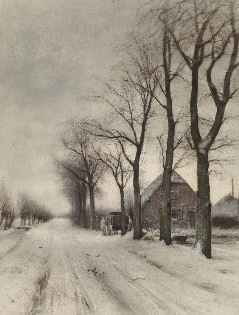 Winter landscape with a farm on a road - Louis Apol Source: Paysage d'hiver avec une ferme sur une avenue - Louis Apol