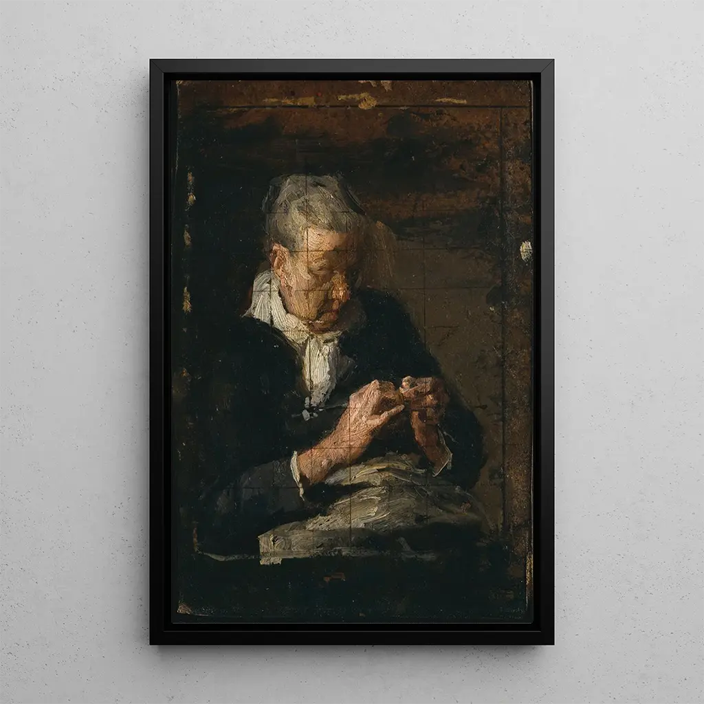 In this delicate art print, Thomas Eakins presents a woman absorbed in the act of knitting, a moment of calm and concentration. The composition highlights the softness of lines and shapes, while warm colors create a welcoming atmosphere. The natural light illuminating the scene accentuates the details of the knitting and the face, revealing emotional depth. This artwork, both intimate and universal, evokes the beauty of everyday gestures and the tranquility of a suspended moment in time.