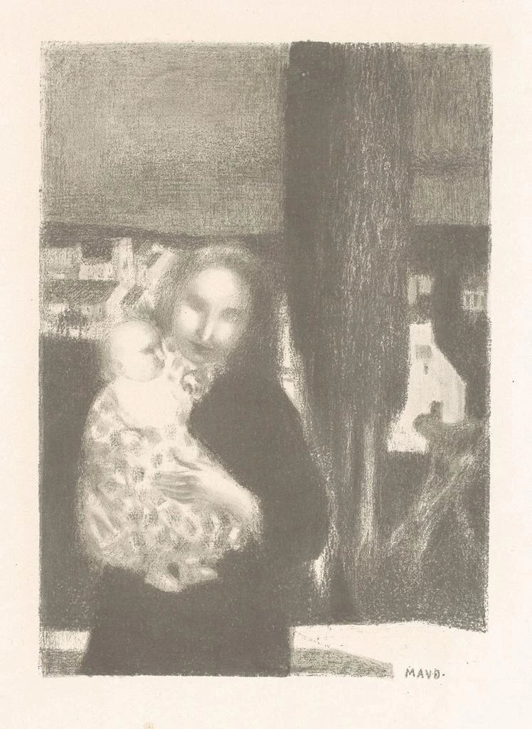 In this artwork, Maurice Denis captures the gentle intimacy of a moment between a mother and her child, enveloped by the serenity of a landscape where a majestic cypress stands. The pastel colors, soft and soothing, evoke an atmosphere of peace and protection. Denis's technique, characterized by delicate brushstrokes, creates a visual harmony that invites contemplation. Every detail, from the knowing gaze between the mother and her baby to the shades of green of the cypress, contributes to a warm and comforting ambiance, making this canvas a true visual poem.