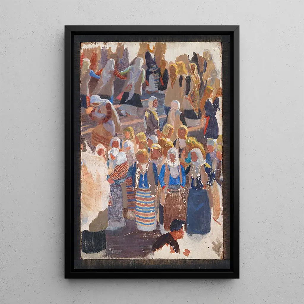 Groupes de femmes dansantes Megara art print by Niels Skovgaard depicts a vibrant scene where several women engage in a collective dance. The fluid, synchronized movements of the dancers create a captivating dynamic, while the bright colors, ranging from red to green, infuse the artwork with contagious energy. Skovgaard's technique, blending realism with impressionist touches, allows viewers to feel the joy and exuberance of this festive moment. Each face, each gesture is carefully rendered, inviting the observer to immerse themselves in the world of dance.