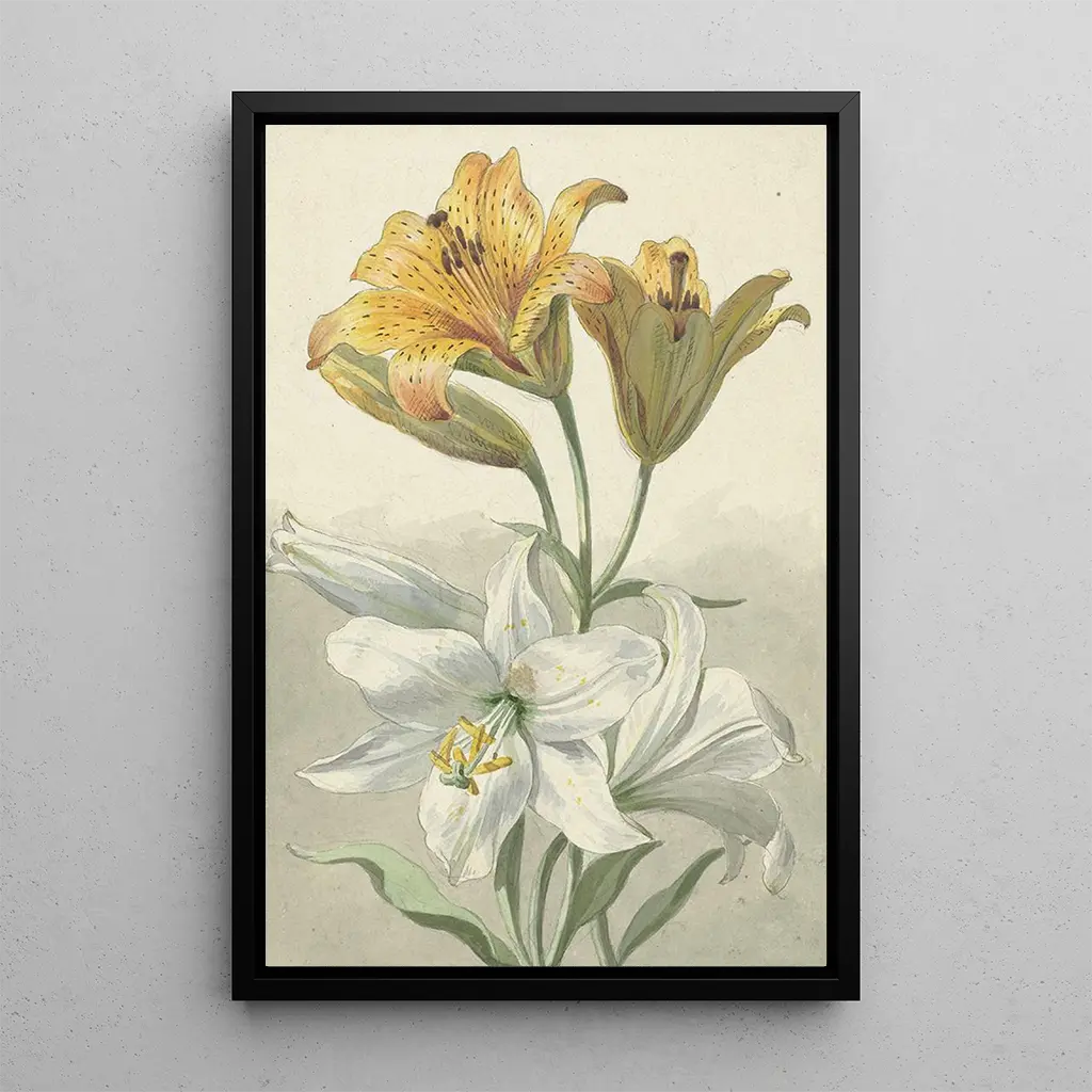 In "Yellow and White Lilies", Willem van Leen transports us to the heart of a lush garden where the beauty of flowers blooms before our eyes. The lilies, majestic and delicate, stand gracefully, their luminous petals harmoniously contrasting with the softer shades of the white flowers. The composition is a true homage to nature, where every detail is carefully rendered using oil painting techniques. The atmosphere emanating from this artwork is both peaceful and joyful, inviting serene contemplation of the floral wonders.