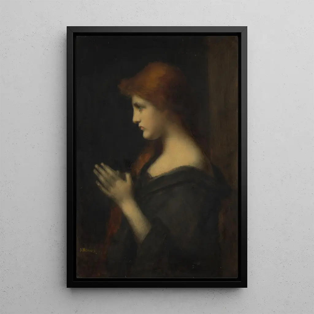 "Young Woman in Prayer" by Jean-Jacques Henner is an art print that evokes inner peace and devotion. This canvas, created with refined technique, features a young woman immersed in a moment of reflection. The soft colors and delicate nuances of the skin create a serene atmosphere, while the light seems to envelop the subject with a sacred aura. The woman's posture, with hands joined and gaze turned towards the sky, conveys deep emotion, inviting the viewer to share this moment of spirituality.