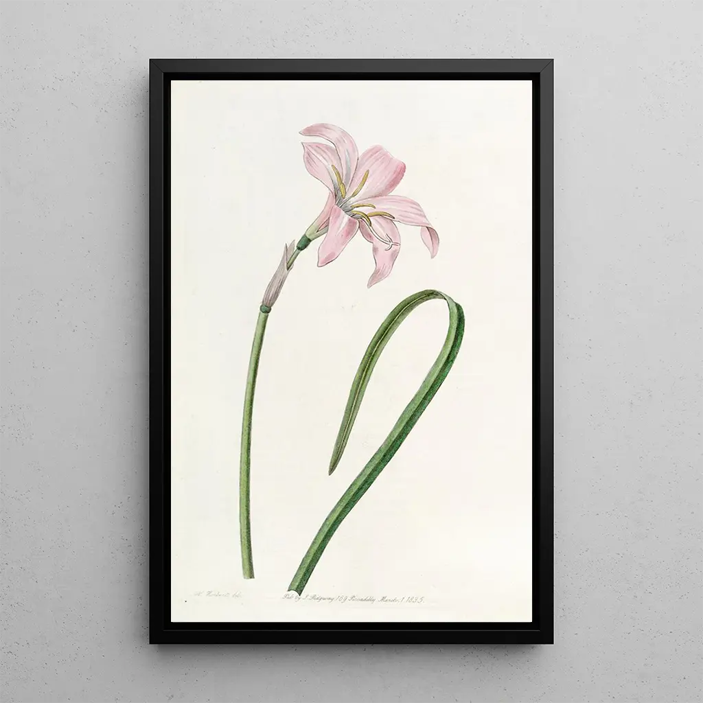 Le tableau Zephyranthes de Spofforth, également réalisé par Sydenham Edwards, est une représentation délicate de cette fleur rare et élégante. Les nuances de blanc et de rose s’entrelacent avec grâce, évoquant la légèreté et la fragilité de la plante. La technique de l’aquarelle permet de capturer la transparence des pétales, tandis que le fond subtilement nuancé évoque un environnement naturel apaisant. Cette œuvre invite à la contemplation, offrant un moment de sérénité à ceux qui l’observent, comme si l’on était transporté dans un jardin secret où la beauté de la nature règne en maître.